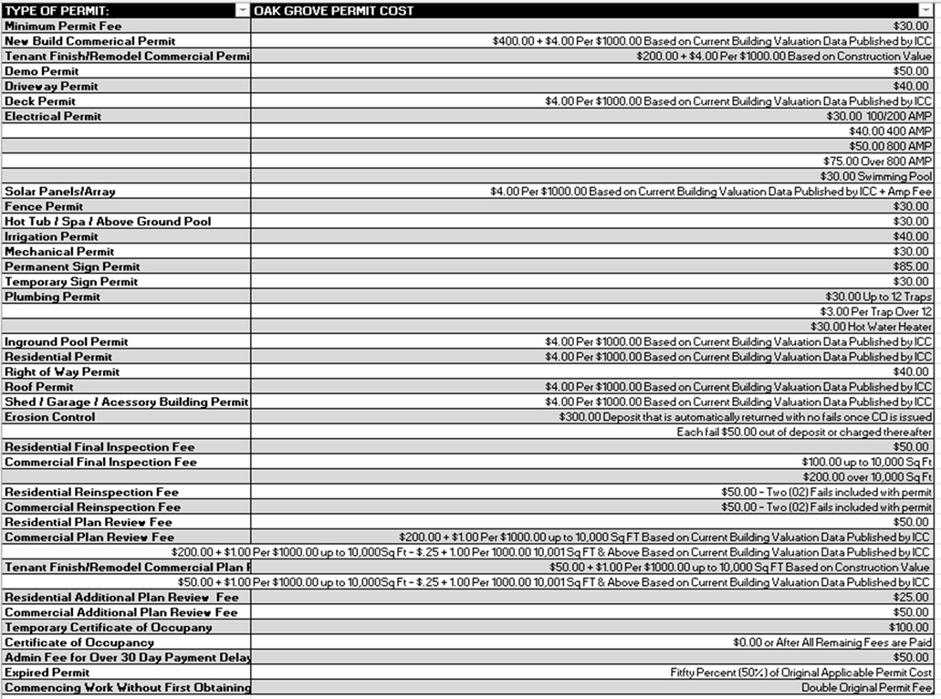 The Building Department will assist with different aspects of the building process such as helping new developments in the community, plan review, issuing of permits, and building inspections.  We are here to ensure the citizens of Oak Grove and its visitors that the development and construction in our town meets all of the building and development codes the City has adopted.  You can visit with us for anything from building a playhouse in the back yard to developing a 500-home subdivision or even building a commercial shopping mall.  This section includes information and application forms for various permits, with a few exceptions, permits are required for the projects listed in the margin to the left.